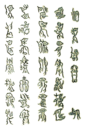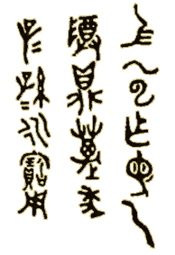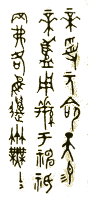 "The emperor having received the prime mandate, the great gift of heaven (imperial rank and dignity), on ascending the throne (571 B.C.) offers this precious basin, to the spirits of heaven and earth, hoping they will prevent internal wars ... To last ten thousands of generations, for ever." (The character 5 in row 1 is anthropomorphic, representing 'Heaven') |