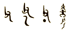 The most frequent of all symbols is the right hand offering the smell of the offered meat, ascending toward the Ancestors (from left). There is often added a kind of tear, symbol of the libation of wine poured down - usually on grass burned after the ceremony, sometime on the naked soil,the splash of which then repre- sented by a dot. |