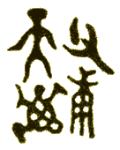 This symbol "text" means (from left to right): To announce to the Ancestors, the fabrication of a bow and arrows, the launching a bark and the building of a dwelling-house. |