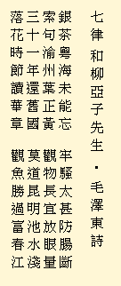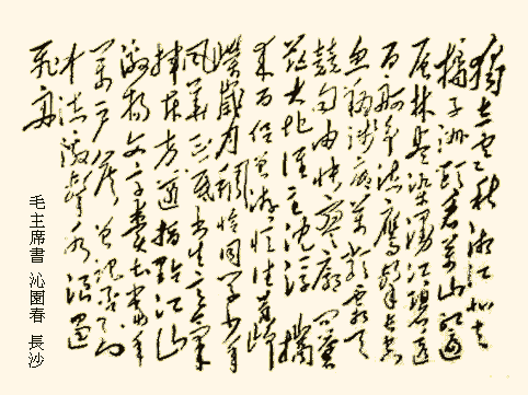 Ch'ang-sha 1925 Standing alone in the autumn cold:The Hsiang flowing northward, Orange Island, the cape. I see thousands of hills in crimsoned view, The woods piling up in deep-dye; The mighty stream, in its gleam of jade, One hundred barques racing by. Eagles high up, cleaving the space, Fish gliding above shallow ground; Ten thousand creatures, under frosty a sky, all fighting for freedom. In the waste's dreariness brooding, I ask the blue space without bonds: Who masters fate's rise and descent? Once I came here with a hundred companions, Vivid the months and years yet, filled with pride. Schoolmates we were, and young altogether, Upright and honest, in the bloom of our lives; Impetuous students, full of enthusiasm, We cast all restraints boldly aside. Pointing to China, its mountains and rivers, Setting the people afire with our words, And counted for muck all those ranking high. Do you still can remember: How, venturing midstream, the oars lashed the waters And the waves yet staying the flight of our boats? (Transl. A.W.T.) |